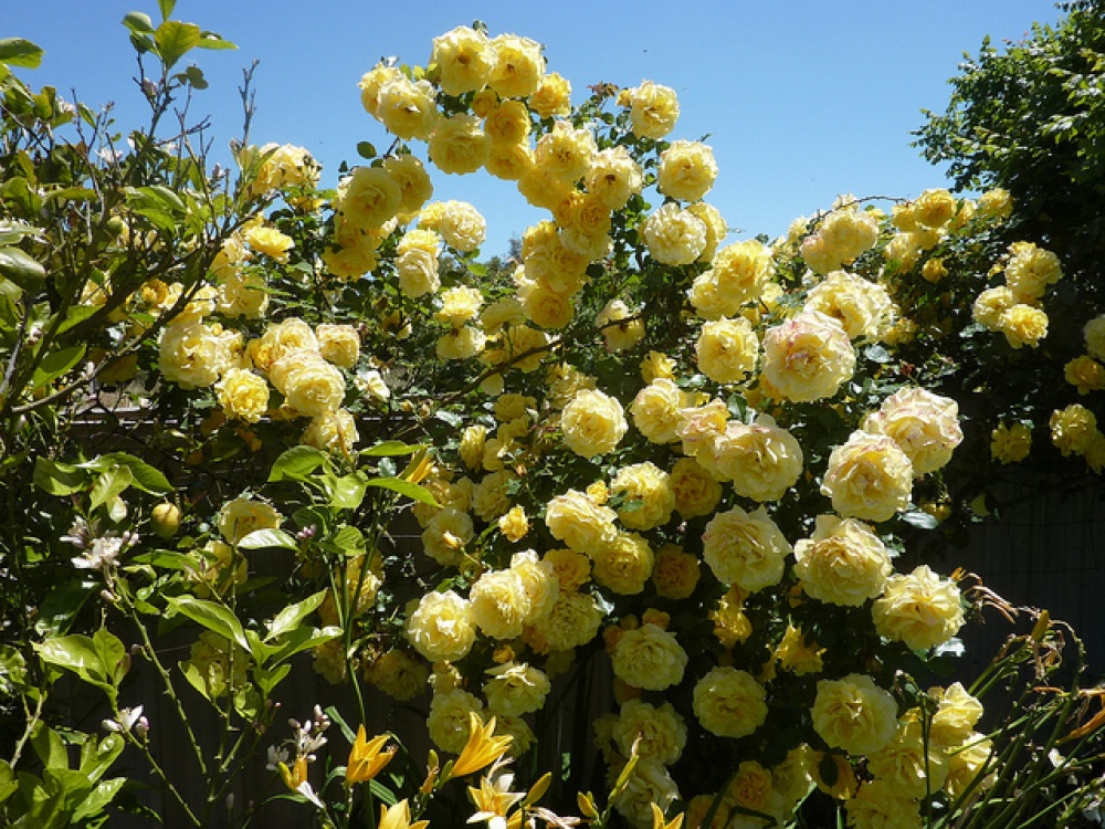 Цветки крупные, 10-11 см, лучше всего выглядит полностью распустившись, когда масса мелких темно-желтых внутренних лепестков контрастирует с более бледными и крупными внешними. Цветки обычно появляются по одному, как у чайно-гибридных роз, в первом цветении, и кистями, как у Флорибунт, повторная. Аромат довольно насыщенный, фруктовый. Куст прямостоячий, зимостойкий, с крупной блестящей листвой, достигает 3-4 м. Бутоны удлиненно-заостренные. Цветки лимонно-желтые, красивой бокаловидной формы, крупные 8-9 см. Махровые (40 лепестков), душистые (чайные). Лепестки широкие, а к центру уже мельче, одиночные или в небольших соцветиях по 3-5. Листья темно-зеленые, очень блестящие. Шипы крупные. Кусты свыше 2 х метров высотой. Цветения обильные, хорошо повторяющиеся.